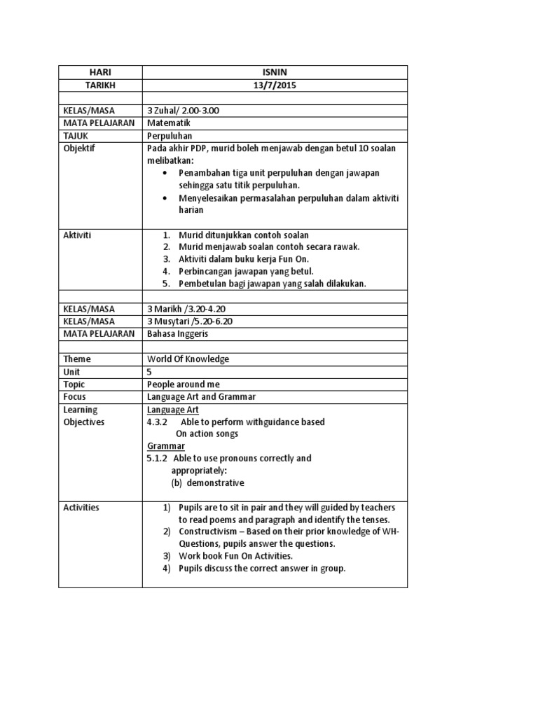 Peruntukan masa tertentu untuk AKTIVITI PdP setiap soalan yang diberi. Examples Contoh Guru menggunakan contoh yang baik dalam PdP untuk mengukuhkan kefahaman pelajar 8. 3 Jumlah murid.